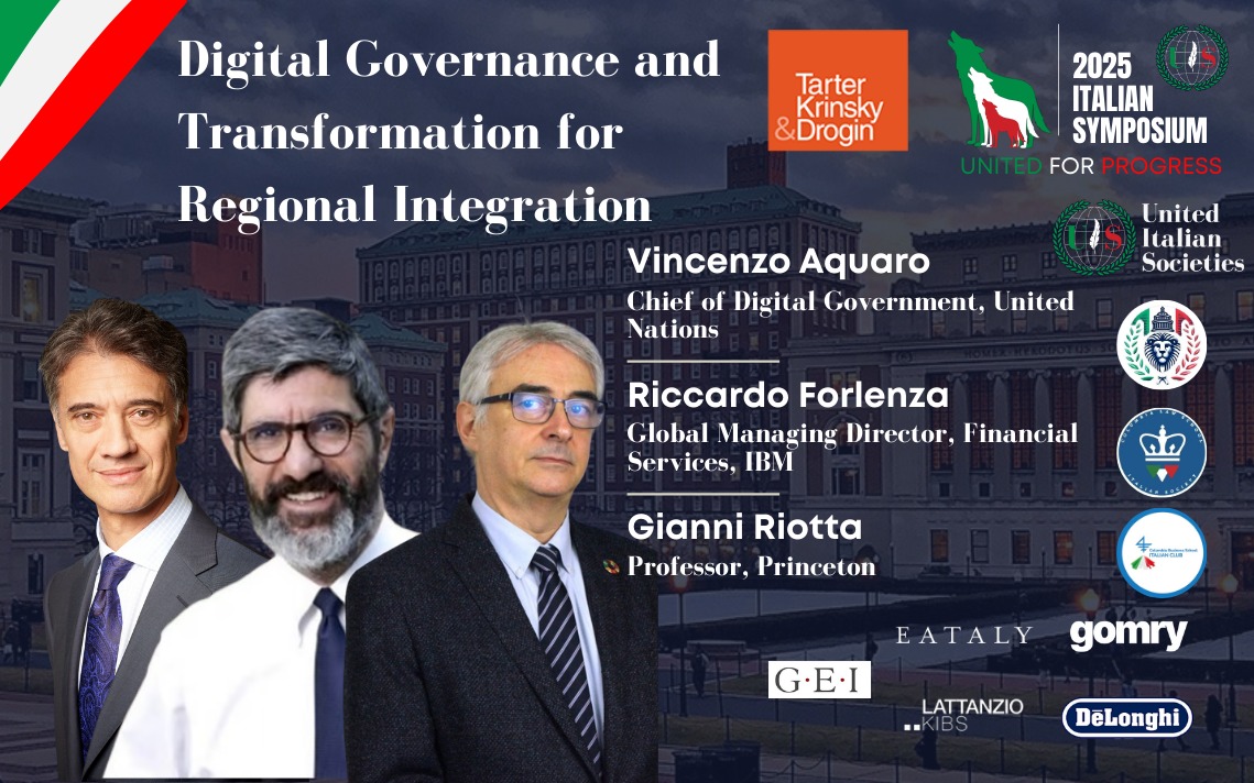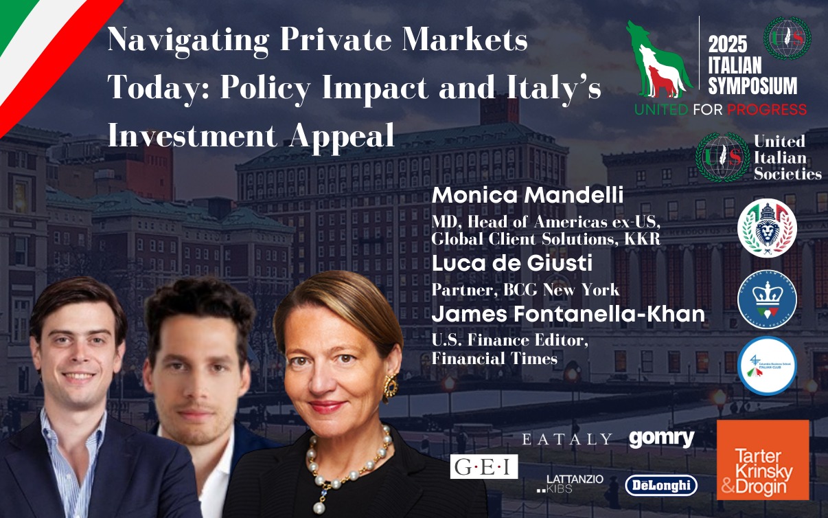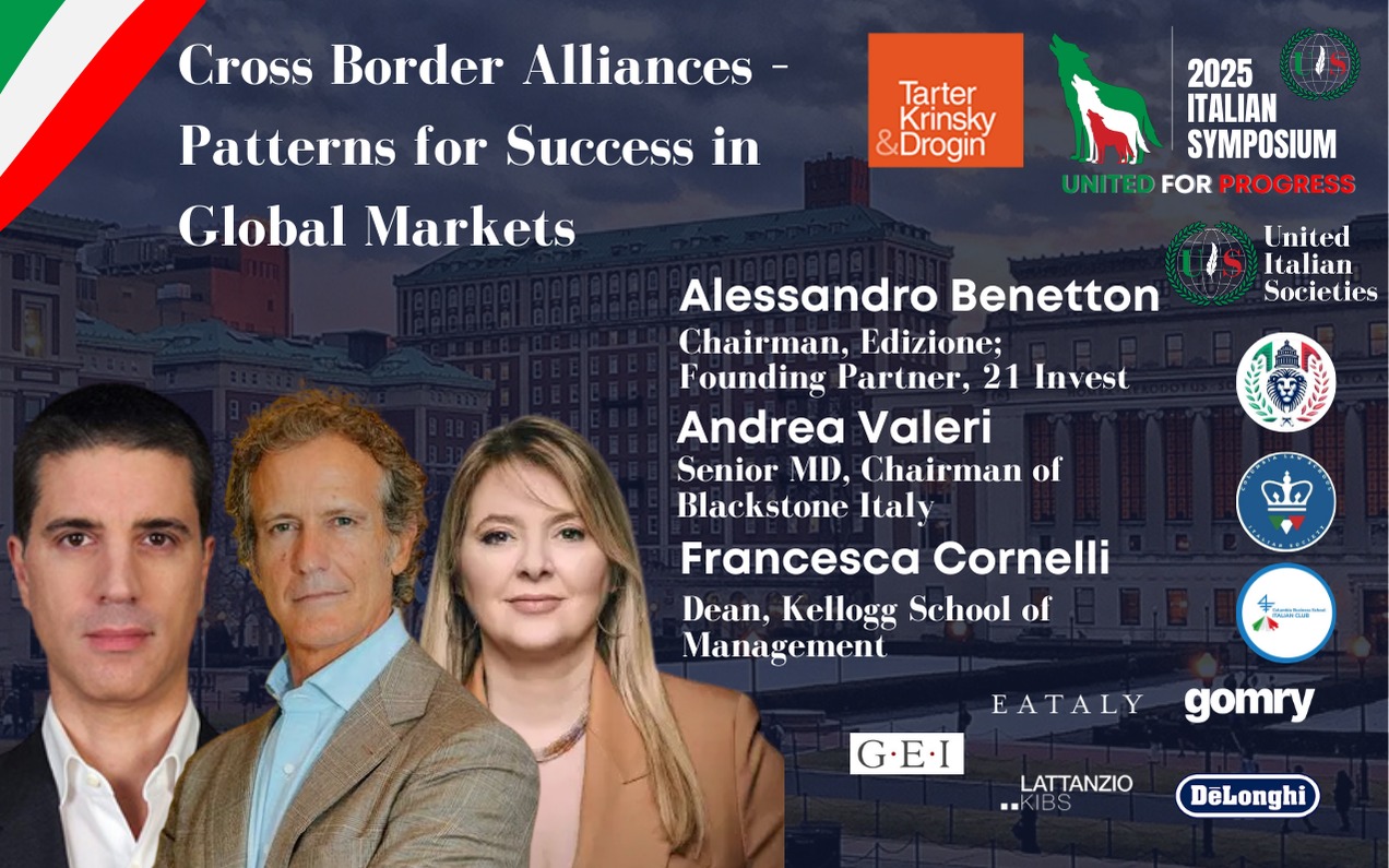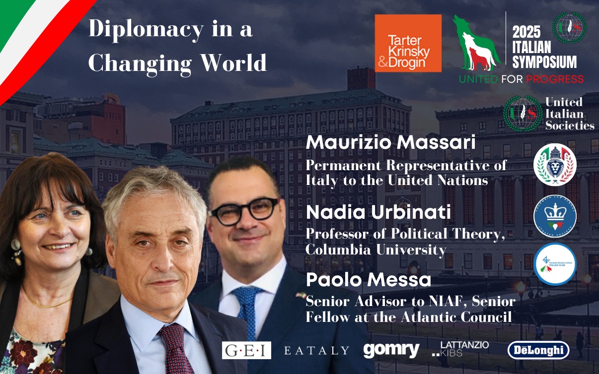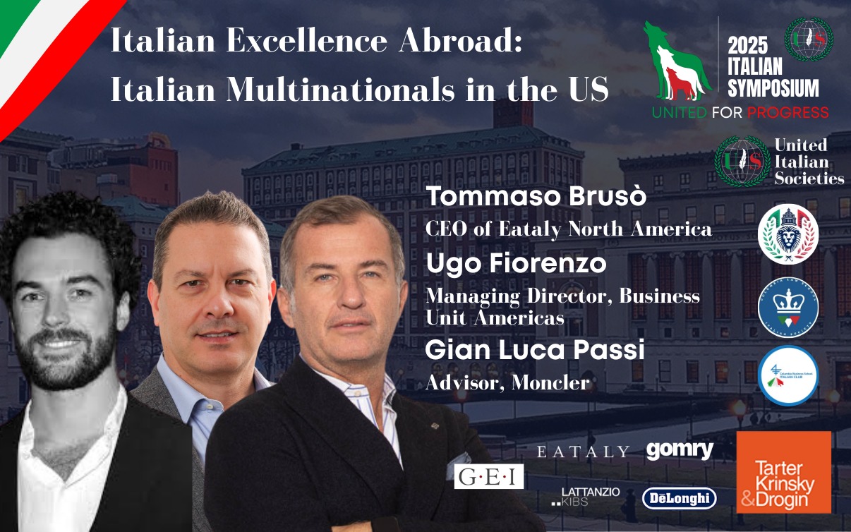 The "2025 Italian Symposium - United for Progress" is proudly presented by United Italian Societies, a non-profit organization dedicated to connecting, supporting, and representing Italian university students abroad, in collaboration with the Italian Societies of Columbia University, Columbia Law School, and Columbia Business School.